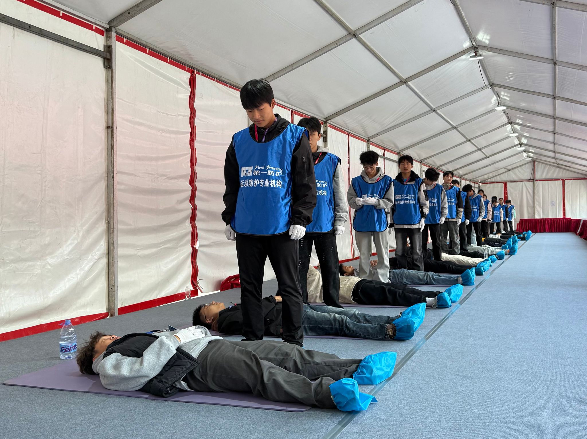 随着选手陆续抵达拉伸区,同学们各司其职:有的引导动线、有的辅助穿戴鞋套,更多的同学跪在垫前,细致地为选手拉伸放松。他们手法专业、态度亲切,成为赛后服务区里一道青春而温暖的风景。